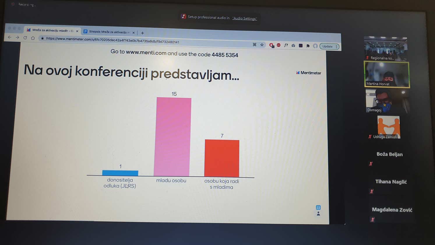 Martina Horvat regionalna koordinatorica iz Ambidekster kluba predstavila je tematsku mrežu, pozvala organizacije da se priključe te istaknula značaj povezivanja i zajedničkog zalaganja za kvalitetnije politike za mlade utemeljene na istraživanjem utvrđenim potrebama. Dorotea Tuškan prezentirala je preliminarne rezultate 72 fokusne grupe s ukupno 318 sudionika, dominantno mladih te onih koji rade s mladima.