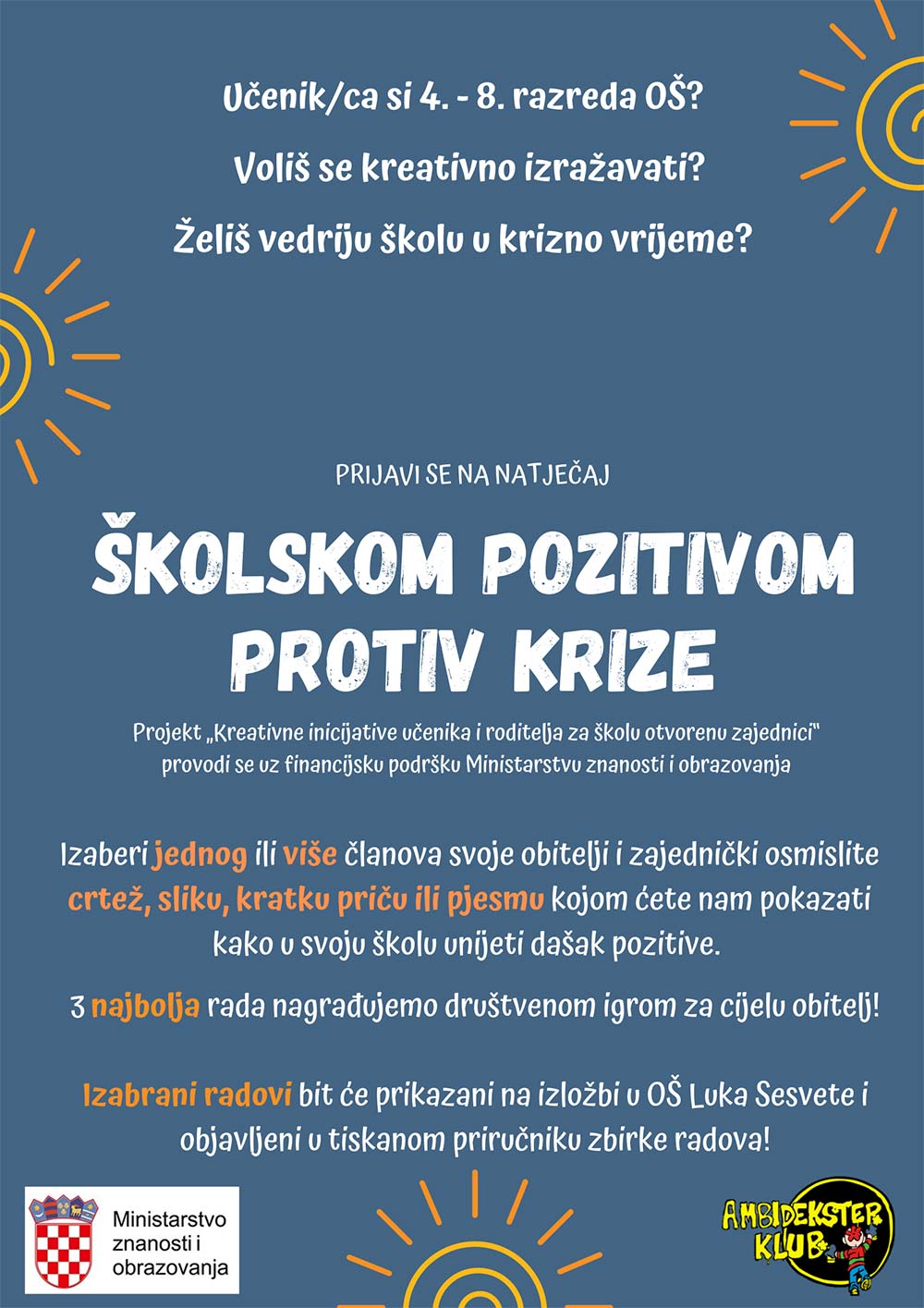 Ambidekster klub poziva sve učenike i učenice od 4. do 8. razreda osnovne škole na sudjelovanje u kreativnom natječaju pod nazivom „Školskom pozitivom protiv krize“.